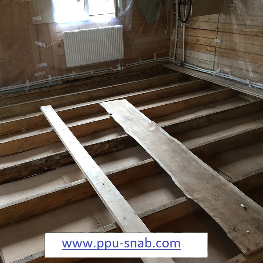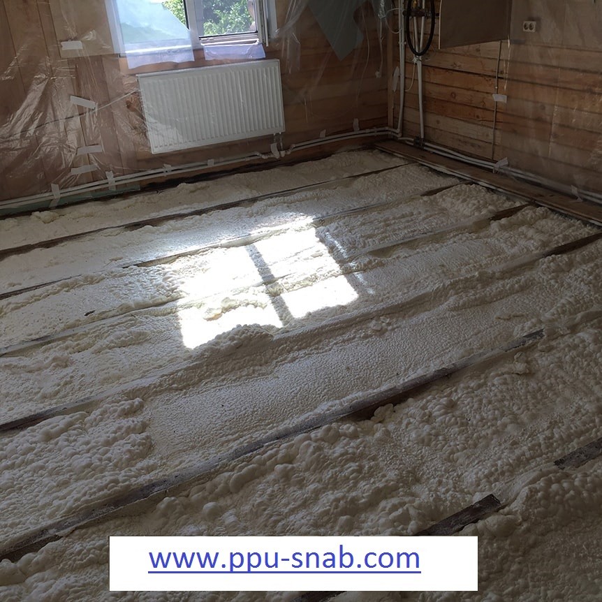 Технология утепления внешне напоминает работу с краскопультом. Поверхность должна быть сухой и очищенной. Для распыления используется оборудование высокого давления, с помощью которого происходит смешивание полиоловой смолы с отвердителем. Химическая реакция между двумя компонентами создает защитный слой на поверхности. Средняя производительность установки считается от 5 кг/мин. Такая мощность позволяет быстро выполнить утепление частного деревянного дома на большой площади. Конфигурация и форма конструкций может быть любая. Вещество почти молниеносно проникает в любые щели и углубления. Материал подходит как для новых, так и старых домов. Если требуется утеплить старый пол, то новые лаги и черновой пол необходимо обработать антисептической пропиткой для дерева.